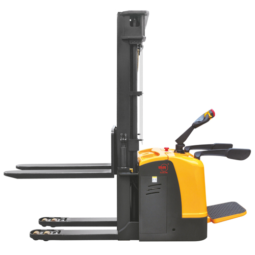 ■承載能力可達1噸。站人平臺起升高度1.2米。方便高層貨架貨物的裝卸和揀選工作。站人平臺前部配有小置物架可承載60kg左右的輕便貨物。EPS電子轉向系統(tǒng)加上自主研發(fā)設計的轉向舵