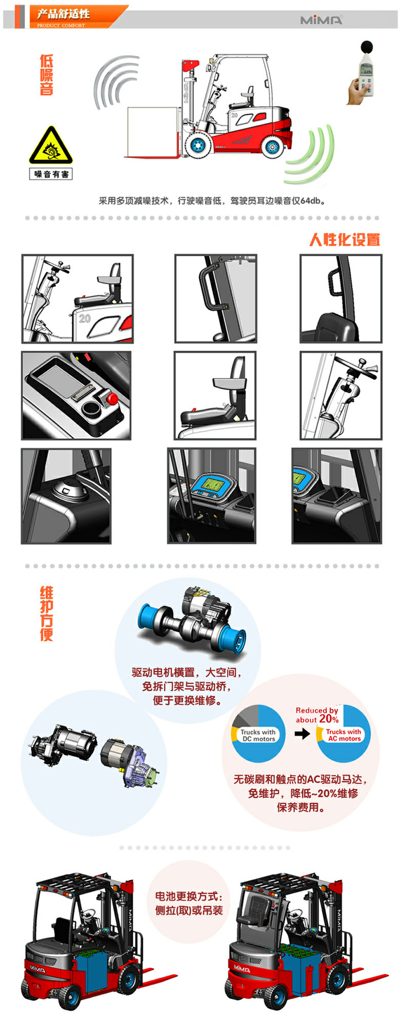 優(yōu)良的產(chǎn)品性能 1 依照歐洲標準ENSIP EN-ISO 5353中關(guān)于SIP要求設(shè)計的叉車駕駛室,讓操作更舒適; 2 多功能LCD數(shù)字控制儀表具有運行時間顯示、故障代碼顯示、蓄電池顯示、低電壓警示閃